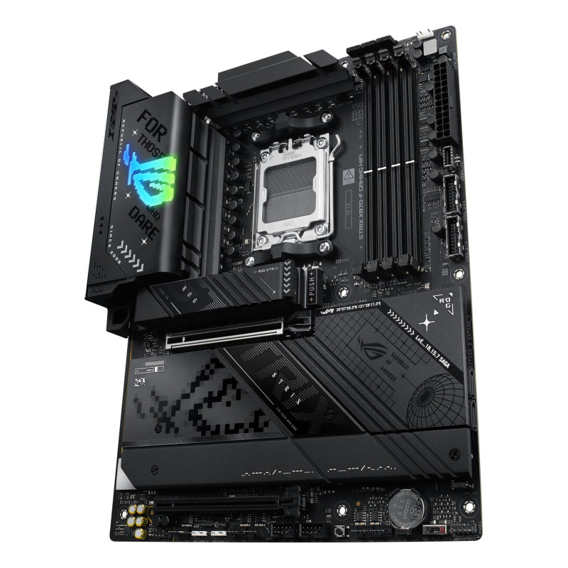 The ROG Strix X870-F is sleek and understated, empowering you to seamlessly combine it with a wide range of system components. Its deep black PCB and matching metallic heatsinks create a dark and intense look, while a touch of RGB lighting on the I/O shroud lets you either stay under the radar or make a bold statement.