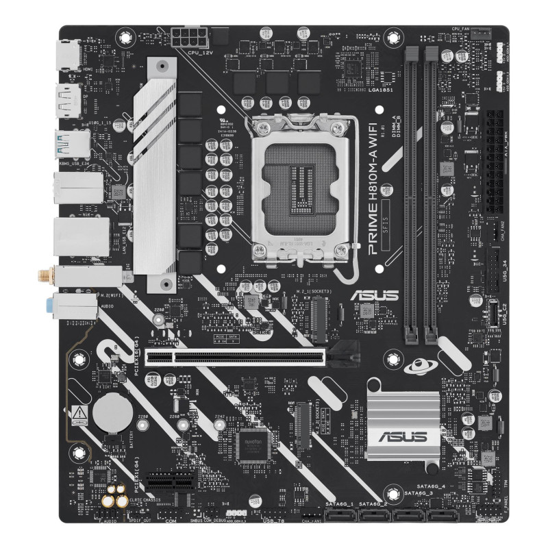| Summary | ASUS PRIME H810M-A WIFI. Processor manufacturer: Intel, Processor socket: LGA 1851 (Socket V1), Compatible processor series: Intel Core Ultra (Series 2). Supported memory types: DDR5-SDRAM, Maximum internal memory: 128 GB, Memory slots type: DIMM. Supported storage drive interfaces: M.2, SATA III, Supported storage drive types: HDD & SSD, RAID levels: 0, 1, 5, 10. Ethernet interface type: Gigabit Ethernet, Top Wi-Fi standard: Wi-Fi 6 (802.11ax), Wi-Fi standards: Wi-Fi 6 (802.11ax). Component for: PC, Motherboard form factor: micro ATX, Motherboard chipset family: Intel |