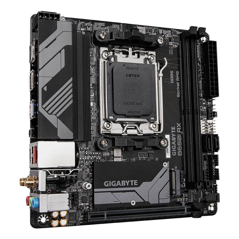 | Summary | GIGABYTE B650I AX Motherboard - AMD Ryzen 9000 Series CPUs, 5+2+1 Phases VRM, up to 6400MHz DDR5 (OC), 1xPCIe 4.0 M.2, 2.5GbE LAN, WIFI 6E, USB 3.2 Gen 2. Processor manufacturer: AMD, Processor socket: Socket AM5, Compatible processor series: AMD Ryzen 7000 Series, AMD Ryzen 8000 Series, AMD Ryzen 9000 Series. Supported memory types: DDR5-SDRAM, Maximum internal memory: 128 GB, Memory slots type: DIMM. Supported storage drive interfaces: M.2, SATA III, Supported storage drive types: HDD & SSD, RAID levels: 0, 1. Maximum resolution: 4096 x 2160 pixels. Ethernet interface type: 2.5 Gigabit Ethernet, LAN controller: Realtek RTL8125, Top Wi-Fi standard: Wi-Fi 6E (802.11ax) |