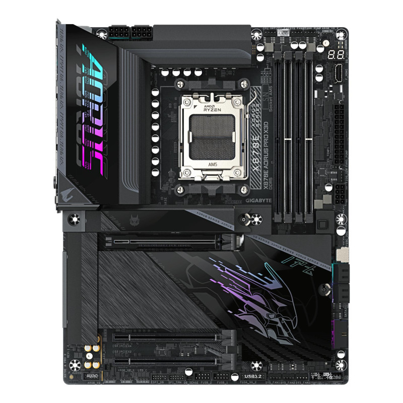 | Summary | GIGABYTE X870E AORUS PRO X3D Motherboard - Supports AMD Ryzen 9000 CPUs, 18+2+2 Phases Digital VRM, up to 9000Hz DDR5 (OC), 2xPCIe 5.0 + 2xPCIe 4.0, Wi-Fi 7, 5GbE LAN, USB 4. Processor manufacturer: AMD, Processor socket: Socket AM5, Compatible processor series: AMD Ryzen 7000 Series, AMD Ryzen 8000 Series, AMD Ryzen 9000 Series. Supported memory types: DDR5-SDRAM, Maximum internal memory: 256 GB, Memory slots type: DIMM. Supported storage drive interfaces: M.2, PCI Express 4.0, PCI Express 5.0, SATA III, Supported storage drive types: HDD & SSD, RAID levels: 0, 1, 5, 10. Maximum resolution: 4096 x 2304 pixels. Ethernet interface type: 2.5 Gigabit Ethernet, 5 Gigabit Ethernet, Fast Ethernet, Gigabit Ethernet, LAN controller: Realtek RTL8126, Top Wi-Fi standard: Wi-Fi 7 (802.11be) |
