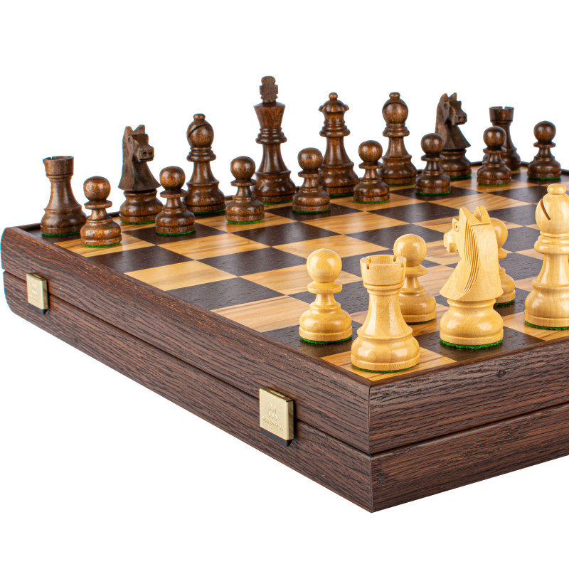 The set consists of a perfectly matched Olive Burl chessboard, crafted by skilled craftsmen in the Manopoulos workshop in Greece using the art of marquetry. The chess pieces are weighted and have a 8.9 cm high king. Carefully selected wood veneers, traditional design and exceptional craftsmanship using the art of marquetry bring this wooden chess collection to life.