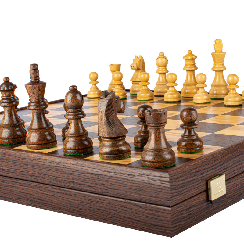 Olive Burl Chess Set 43x43 cm (Medium) with Staunton Chess Pieces and 8.9 cm King. This unique wooden chess set consists of a variety of thoughtfully crafted products. The set includes a perfectly matched Olive Burl chessboard, crafted by skilled craftsmen in the Manopoulos workshop in Greece using the art of marquetry. The chess pieces are weighted and have a 8.9 cm high king. Carefully selected wood veneers, traditional design and exceptional craftsmanship using the art of marquetry bring this wooden chess set to life. Staunton chess pieces - the ones we know and love, the ones we simply think of as chess pieces. These classic chess pieces are named after Howard Staunton, who was considered one of the world's greatest players. The horse, the most complex and distinctive piece in any chess set, is a realistically carved horse's head. Staunton's rider was likely inspired by the sculpture on the east pediment of the Parthenon.