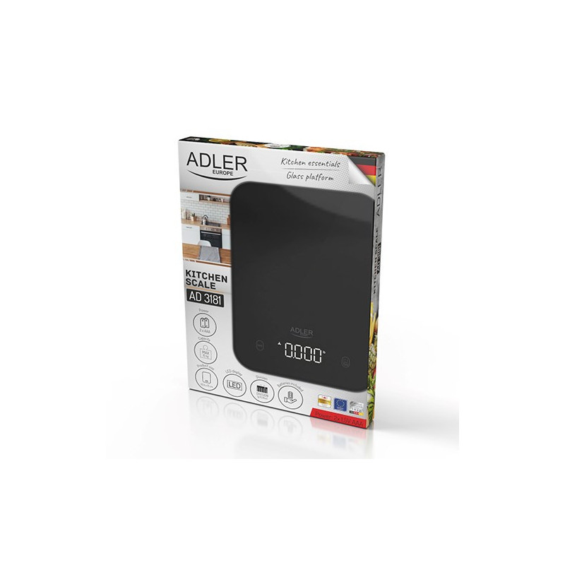 The ADLER AD 3183b kitchen scale has a maximum weight capacity of up to 5 kg and measures with an accuracy of up to 1 g. Its LCD display, automatic shut-off and zero weight function ensure convenient use, and two CR 2032 batteries ensure long-lasting operation.