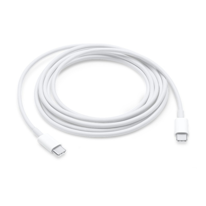 The 'Apple USB-C Charging Cable' is 2 meters long, with male USB-C connectors on both ends. The cable is white and should not be exposed to prolonged moisture.