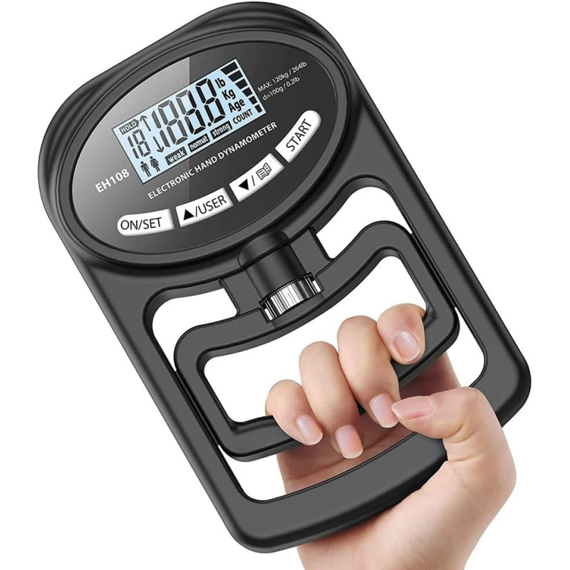 This digital hand grip strength tester measures up to 120kg (265 lbs) with high accuracy. Featuring an ergonomic design, clear LCD display, and USB charging, it’s ideal for both home and gym use.
