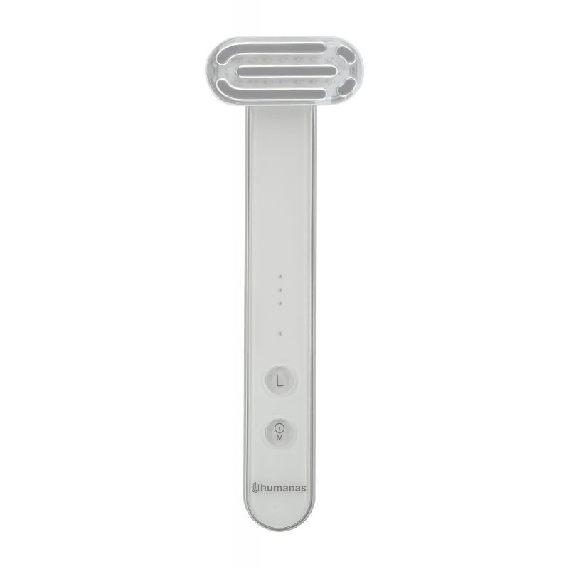 The Humanas Aurora facial massager features EMS technology, red light therapy, and a warming massage function. It has three massage modes, adjustable EMS intensity levels, and a 4200 mAh battery that provides up to 60 minutes of use.