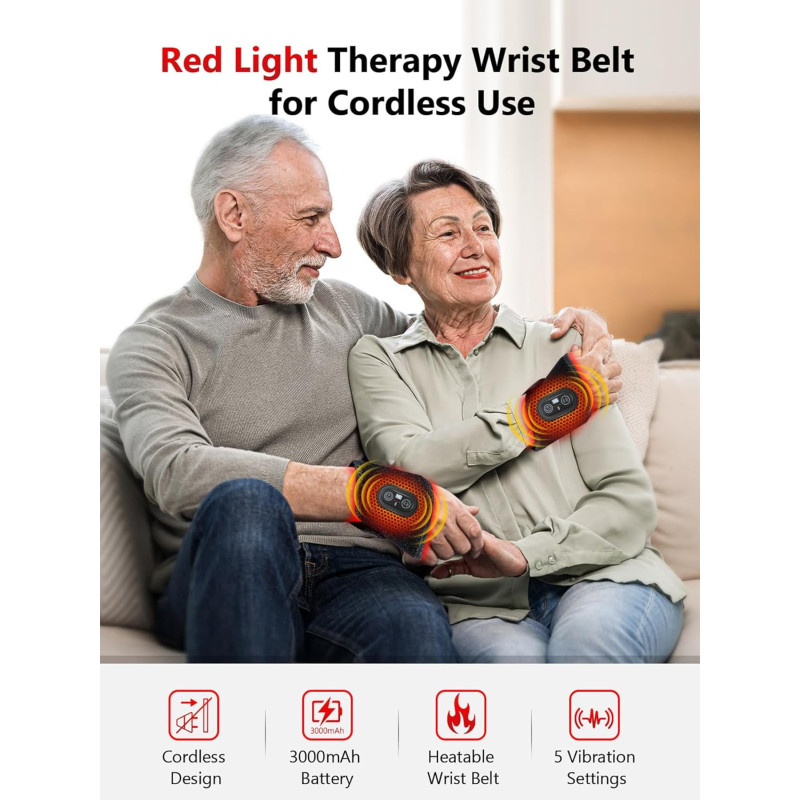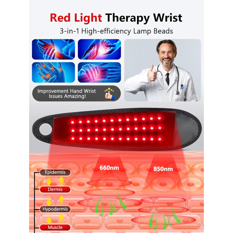 This wireless red light therapy wrap with 48 LED beads provides a warming and relaxing effect. The 660nm and 850nm light technology helps stimulate tissues, while the adjustable strap allows comfortable use on different body areas such as the wrist, waist, or arms.