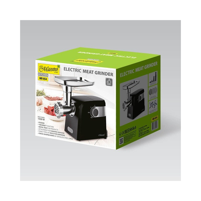 The Maestro MR-854 meat grinder has 1500 W of power and two speed options. It comes with three sieves, two knives, a pusher and a sausage making nozzle.