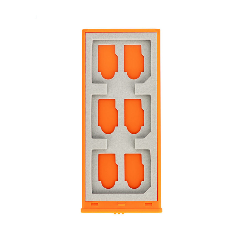 The JJC MCK SD6GO Memory Card Case securely holds 12 micro SD cards and 6 SD cards with a specially shaped interior. It features a compact design and an elastic silicone lanyard that allows it to be easily attached to a key ring, providing protection from dirt and dust.