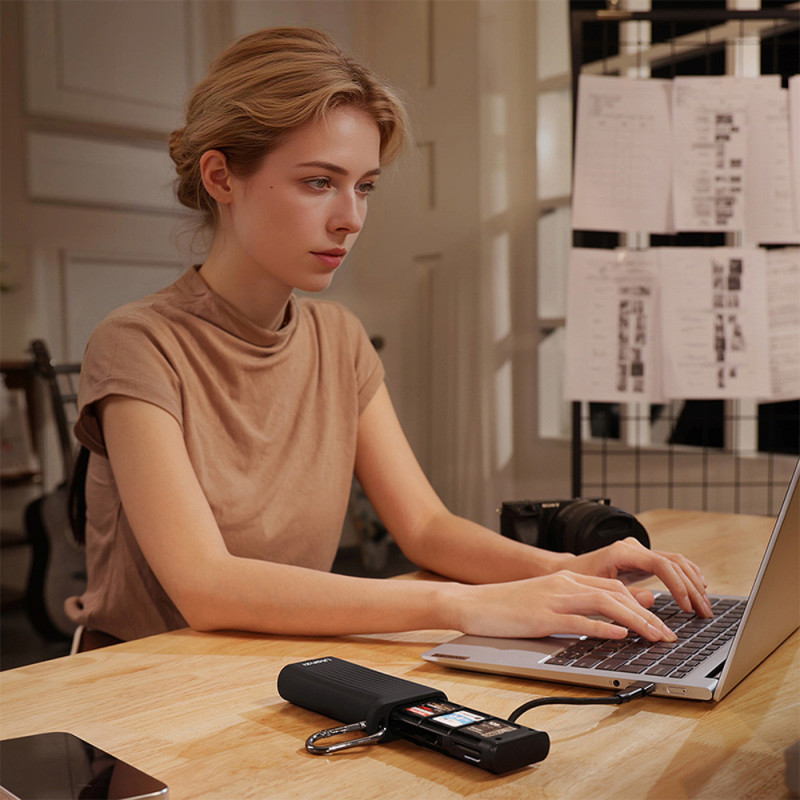 The CR2 All in One Card Case securely holds multiple SD and TF memory cards, while providing high-speed data transfer via two USB and Type C ports. The compact design includes an integrated cable and is IP54 certified, ensuring dust and water resistance.