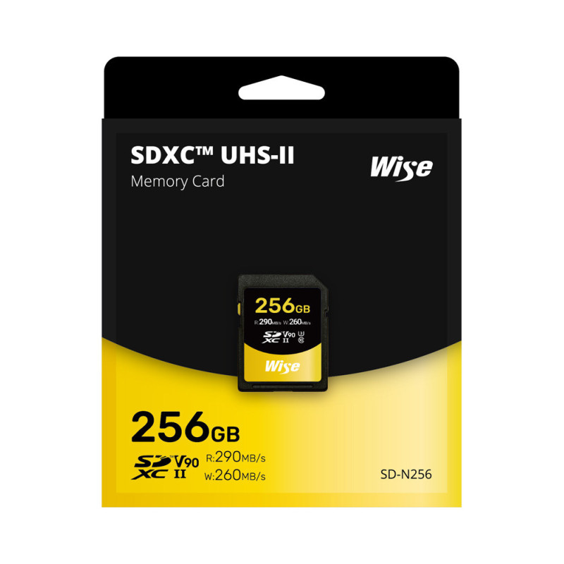The 256GB SDXC UHS II V90 memory card delivers maximum read speeds of up to 290 MB/s and write speeds of up to 260 MB/s, making it ideal for high-quality video recording, including 8K. It is designed for professional camcorders and SLR cameras, and is resistant to water, dust and extreme temperatures.
