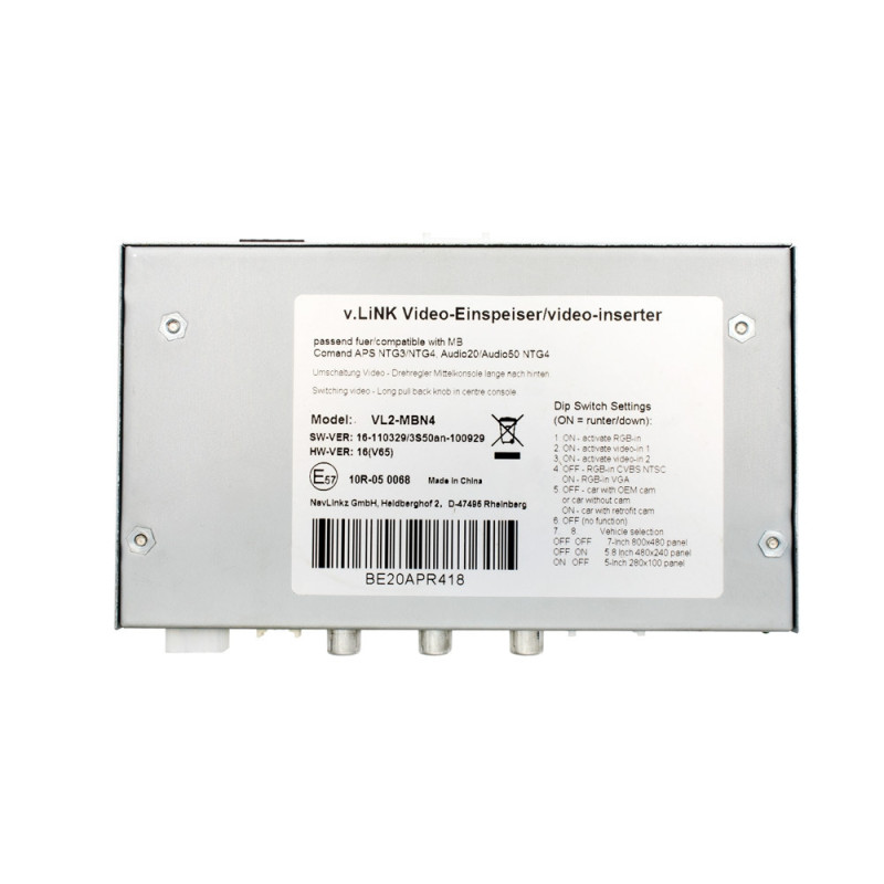 Description V.Link InterfaceVideo for Mercedes vehicles compatible with NTG3 or Comand APS with NTG4, Audio50 APS or Audio20 with 10pin LVDS HSD connector on the monitor. For connecting two video sources (such as a DVD player, DVB-T tuner), RGB sources and a reversing camera.