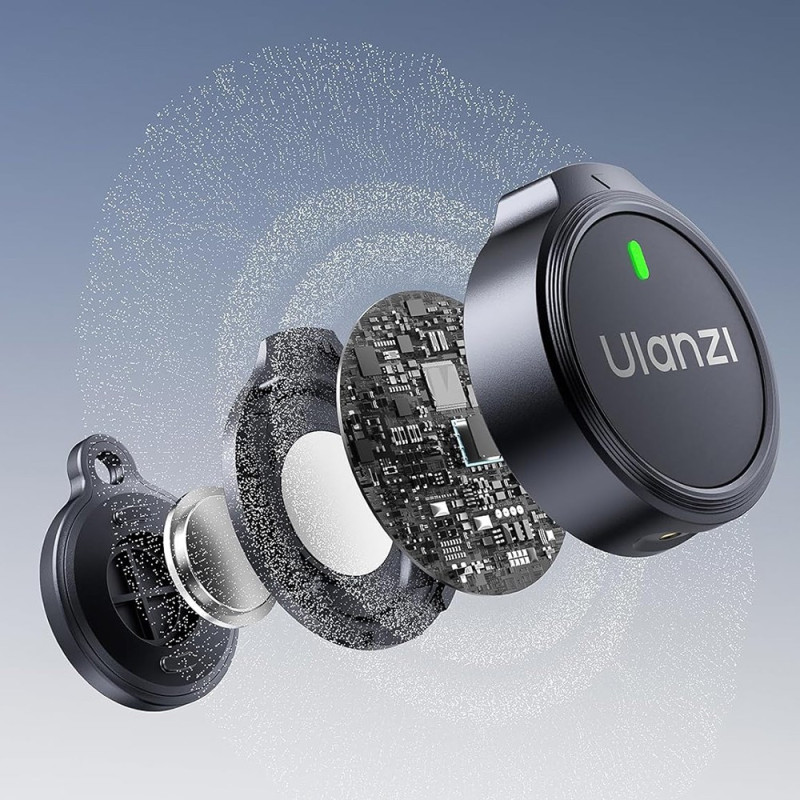The ULANZI A30 Tiny Mic USB-C is a compact wireless microphone system that includes two transmitters with lavalier microphones and a USB-C receiver. The system operates on 2.4 GHz digital transmission, has a range of up to 50 meters and a built-in rechargeable battery that provides up to 5 hours of continuous recording.