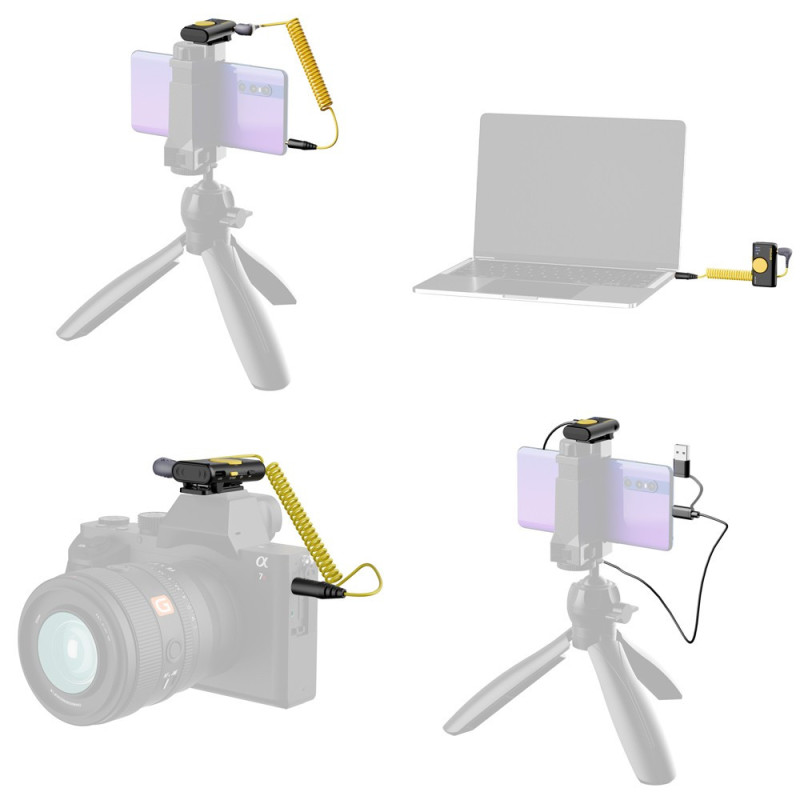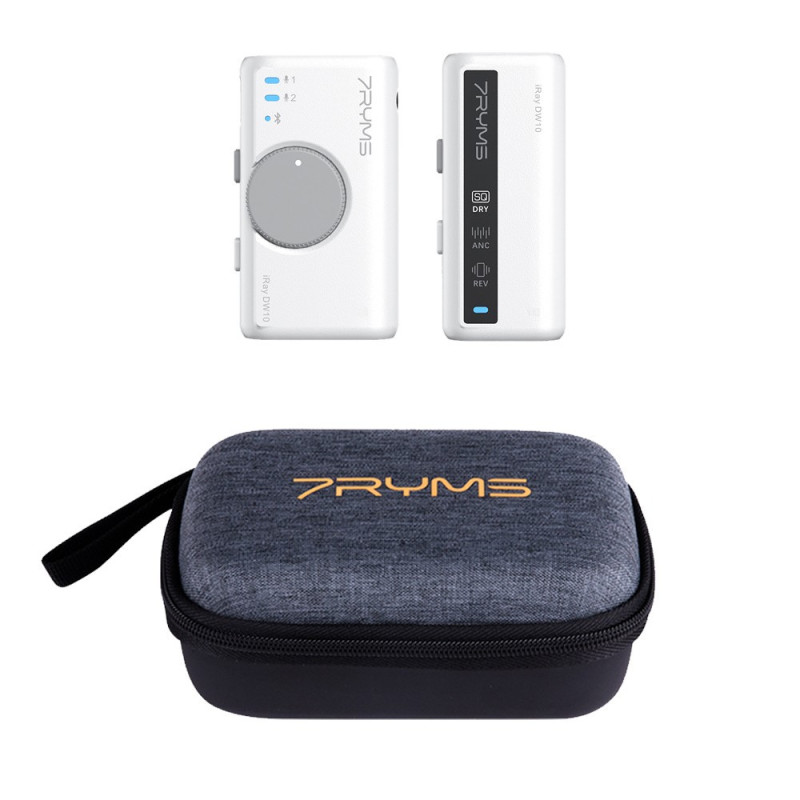 The 7Ryms 'iRay DW10' is a compact wireless microphone operating at 2.4 GHz with a range of up to 100 meters. It features a built-in omnidirectional microphone, USB-C and 3.5 mm compatibility, and three recording modes.