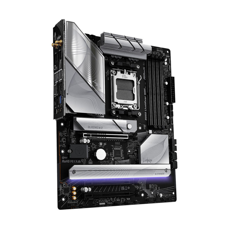 Compatible with AMD Ryzen 7000, 8000, and 9000 series processors using Socket AM5. Features Wi-Fi 7, 256GB DDR5 memory support, and multiple USB ports, including USB Type-C.