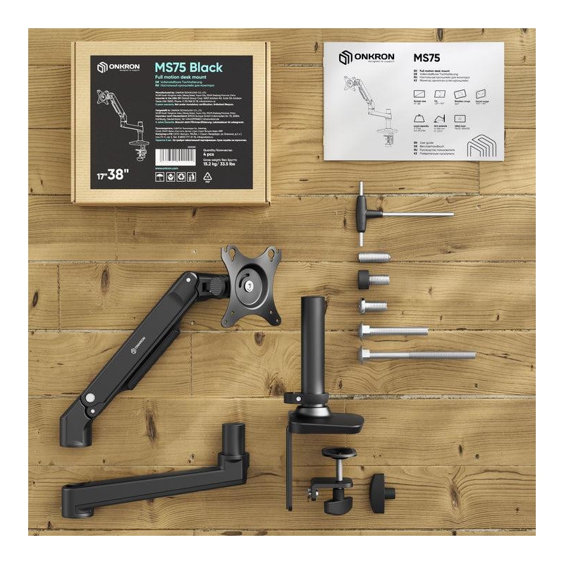 | Summary | ONKRON . Mounting: Clamp/Grommet, Maximum weight capacity: 11 kg, Minimum screen size: 43.2 cm (17"), Maximum screen size: 96.5 cm (38"), Minimum VESA mount: 75 x 75 mm, Maximum VESA mount: 100 x 100 mm. Height adjustment, Swivel angle range: -90 - 90°, Tilt angle range: -25 - 90°. Product colour: Black |