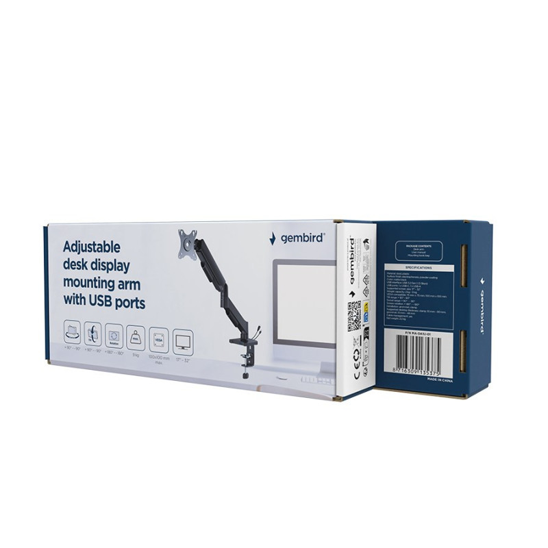 The Gembird MA-DA1U-01 is an adjustable desktop monitor mount arm for screens from 17" to 32" with a maximum weight capacity of up to 9 kg. It has one USB Type-A and one USB Type-C connector for convenient connectivity.
