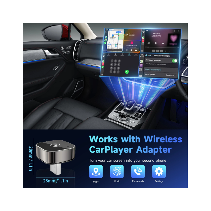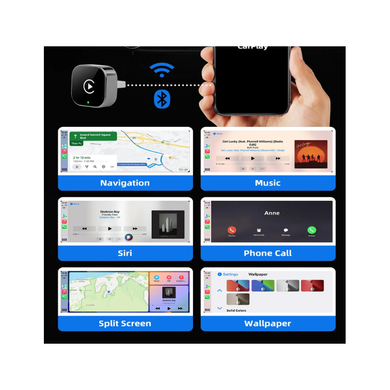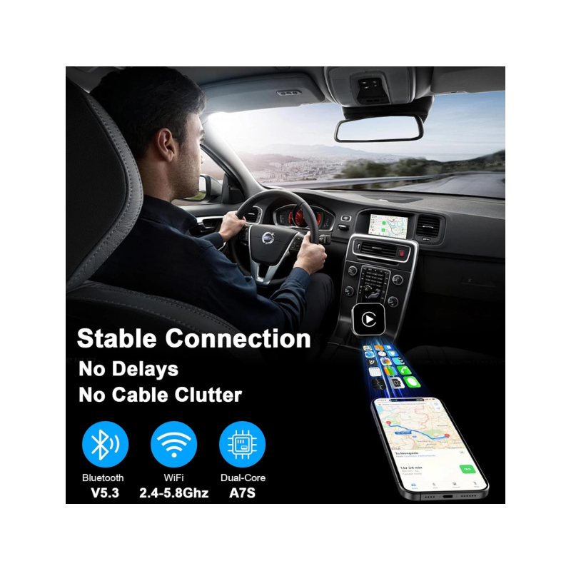 With Bluetooth and dual-band Wi-Fi connectivity, the adapter ensures stable and fast data transmission. It supports popular features such as GPS navigation, music streaming, notifications, calls, and voice commands like Siri or Google Assistant.