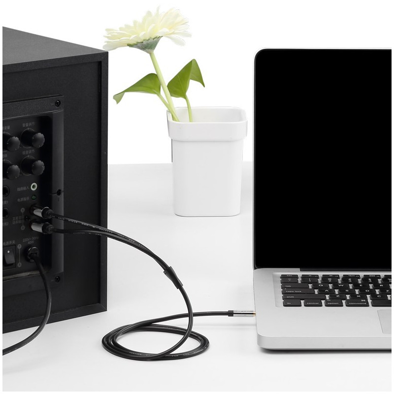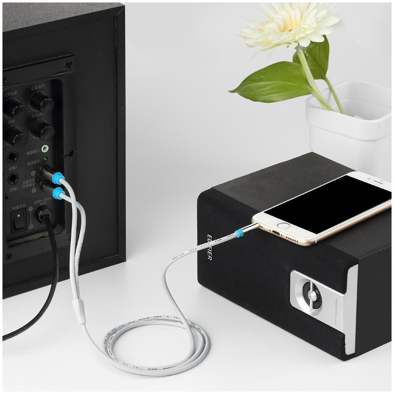 3.5mm male to 2RCA male audio cable for connecting audio devices. The 3 meter long cable is made of tinned copper and has gold-plated connectors for better sound quality.