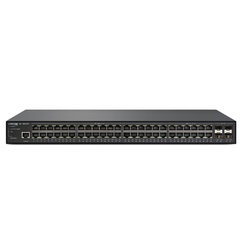 The LANCOM GS-3652XP switch has 48 ports with a total bandwidth ranging from 200 Gbps to 256 Gbps. It supports PoE+ with a 740 W budget and offers advanced security features including RADIUS and TACACS+ authentication methods.