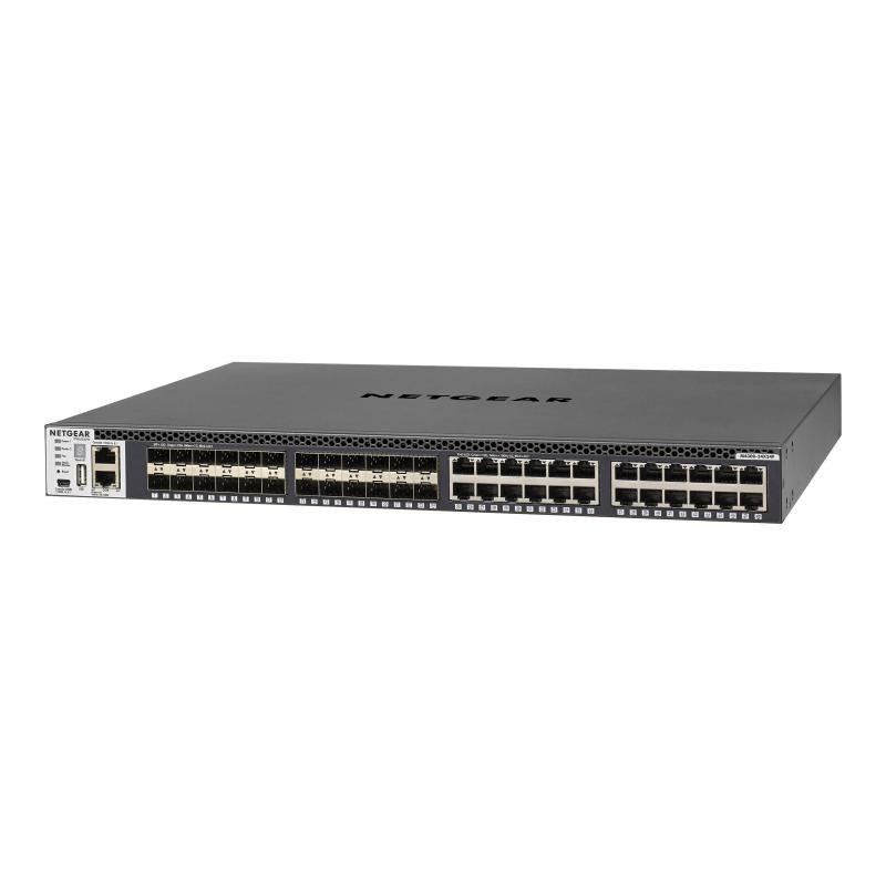 The Netgear Switch XSM4348S-100NES has 48 ports with a transfer rate of 100Mbps. It belongs to the ProSAFE M4300 series and is designed for network technology applications.