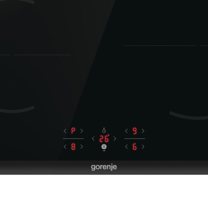 The GORENJE GI6401BC is a built-in induction hob with four cooking zones, including one large 230 mm diameter zone and three medium/small zones. It features glass-ceramic surfaces, touch-sensitive controls, a digital timer and a child lock function.