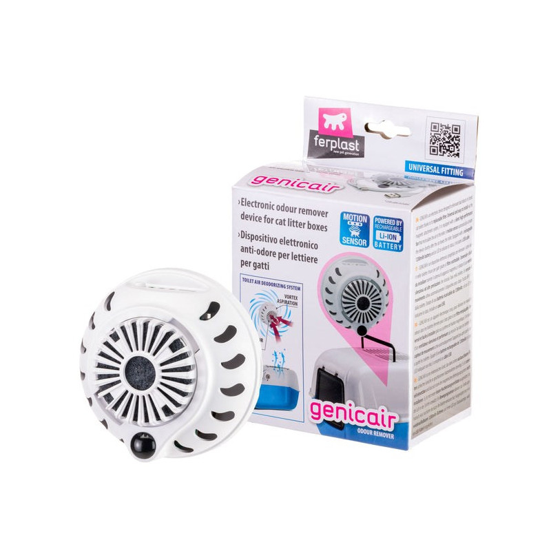 FERPLAST Genicair is an automatic odor neutralizer designed for cat litter boxes. It has three modes, is battery or USB powered, and emits a floral scent.