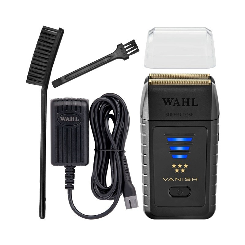 The Wahl Professional Vanish Shaver is a rechargeable shaver designed for precision beard trimming. It features a built-in lithium-ion battery with a run time of 100 minutes and a motor speed of 10,000 RPM.