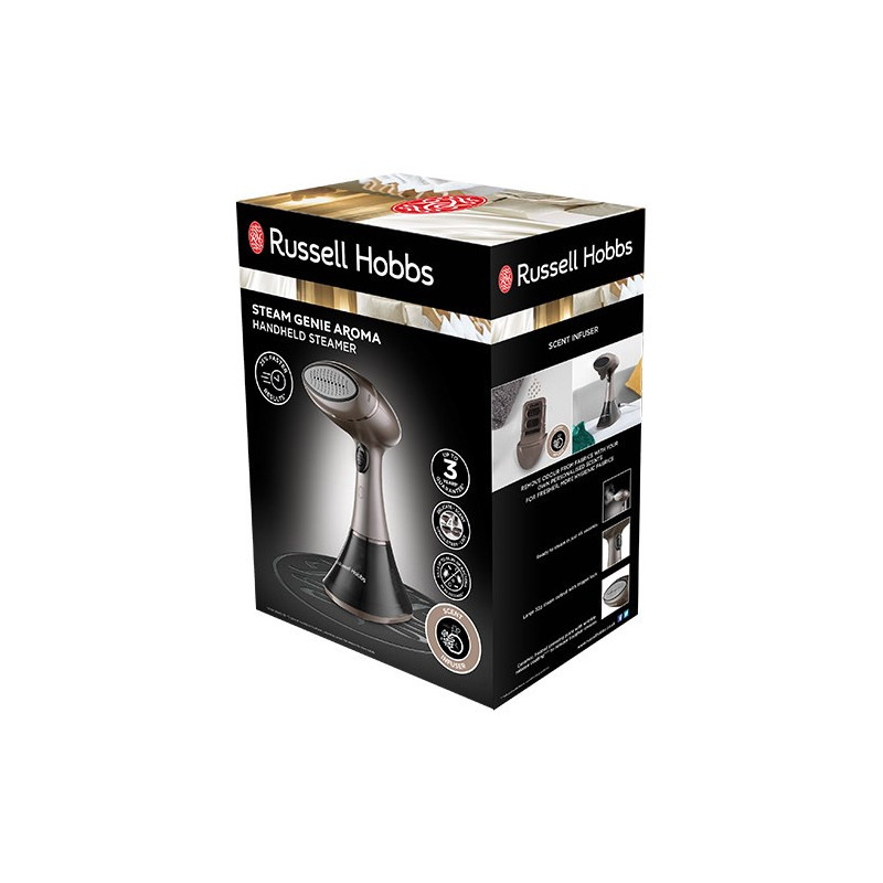 The Russell Hobbs Aroma 28040-56 is a portable garment steamer with a 0.2 L water capacity and 1800 W power. It heats up in 0.75 minutes and provides 32 g/min of steam for up to 6 minutes of continuous use.