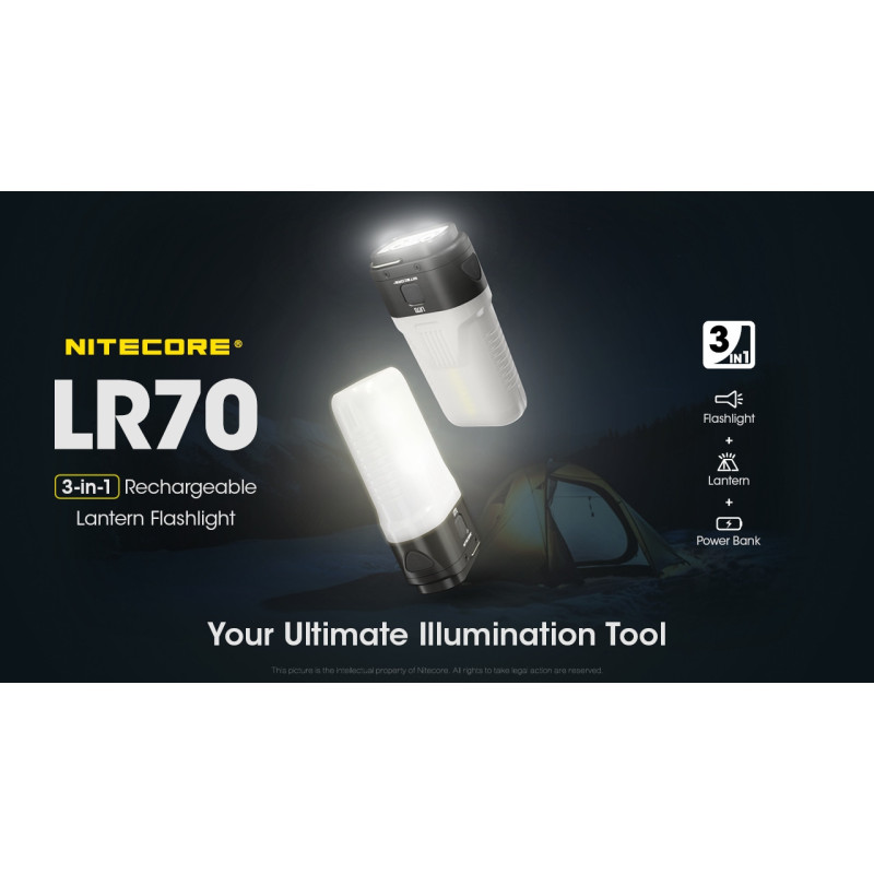 Powerful Dual Lantern and FlashlightThe Nitecore LR70 is a versatile 3-in-1 camping lantern, flashlight, and power bank. When used as a flashlight, it is capable of producing up to 3000 lumens and providing a throw distance of up to 300 m (328 yards), making it ideal for camping and outdoor activities. When you use the LR70 as a lantern, it can emit up to 400 lumens, providing 360-degree illumination whether it's placed on a surface or hung. It also offers multiple red light options, including High and Low brightness settings to preserve your night vision, as well as Beacon and SOS modes for emergency situations. If you're on the move, you can turn the LR70 on its side and use its Flashlight mode, which offers a choice of 5 different brightness settings.