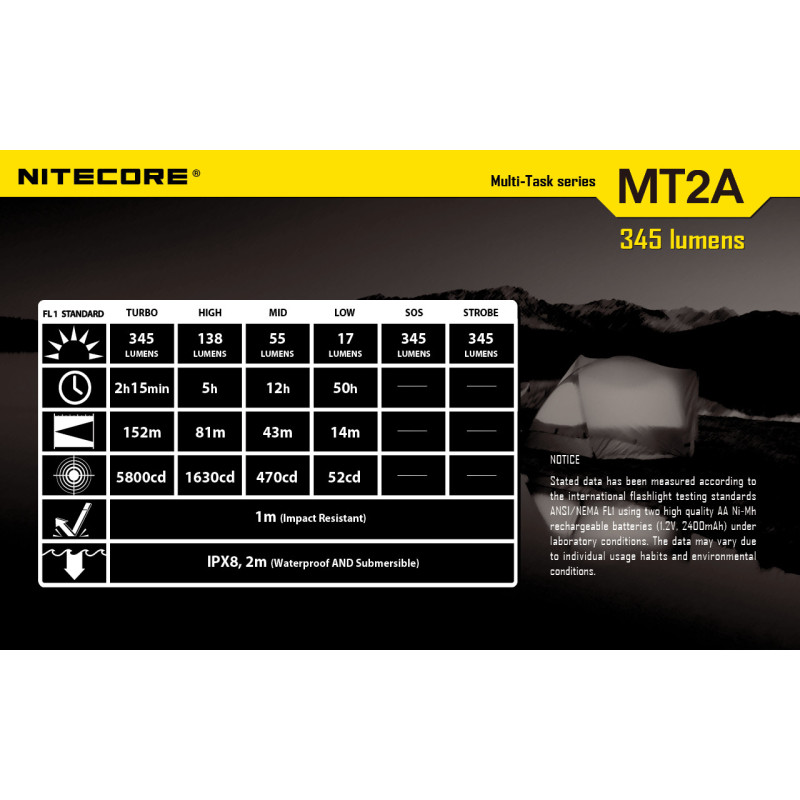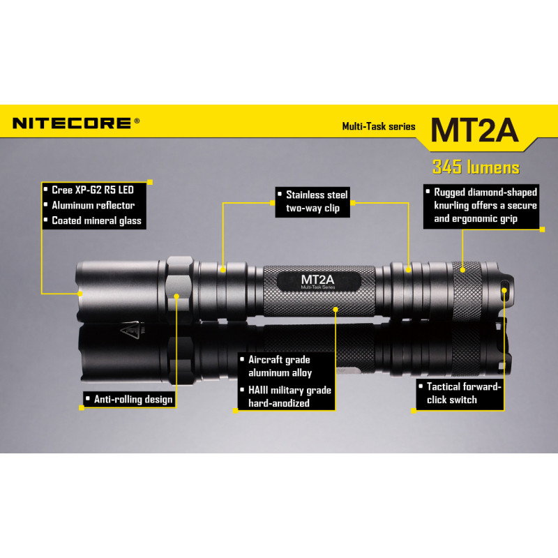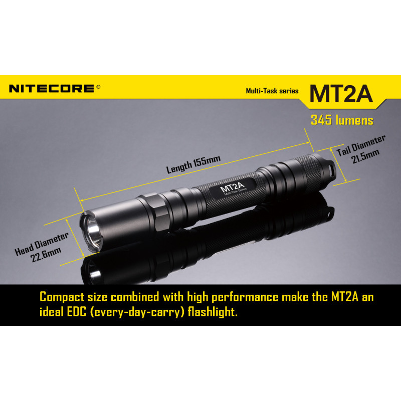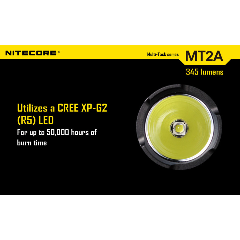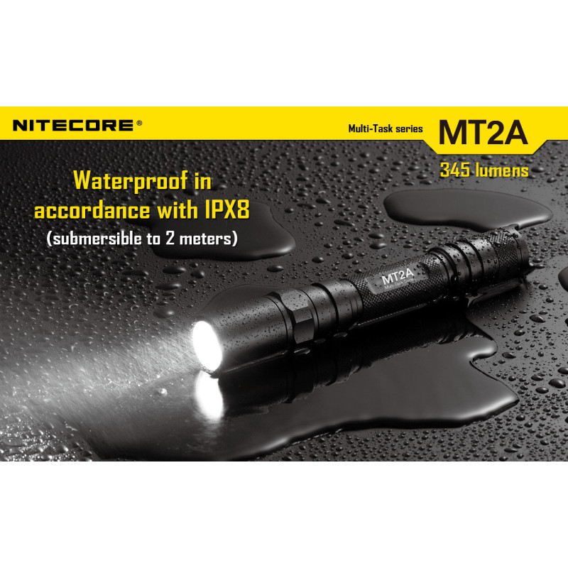 Flashlight - Nitecore Multi-Task Series MT2A Flashlight.Customize your flashlight to your needs. The Nitecore MT2A flashlight is perfect for tactical operations or camping, as well as for home use. The easy-to-use interface allows you to quickly use Turbo mode or a user-defined mode. With a built-in memory function, it can meet even the most diverse user needs. The MT2A allows you to choose from 4 brightness levels - Low, Mid, High and Turbo. The device is extremely lightweight and convenient, yet durable. It shines up to 345 lm and offers 4 brightness levels. You can easily save settings - for example, Turbo + Strobe or Turbo + Mid. It also offers 2 additional modes - SOS and Strobe.