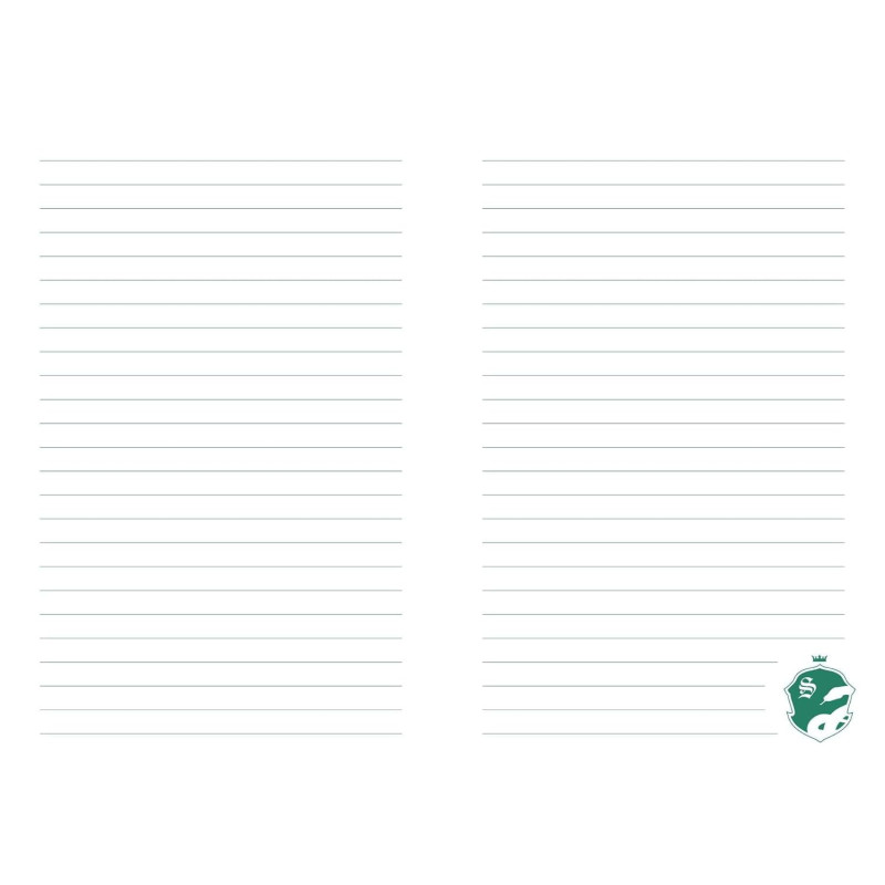 The Slytherin Classic Notebook has a high-quality vegan leather cover and includes 184 lined pages for notes. It comes with a pen decorated with the Slytherin snake and is a convenient size for easy carrying.