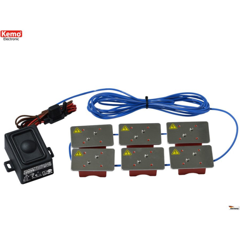 It scares away martens by delivering an electric shock in the engine compartment caused by touching (sliding) plates carrying voltages of approximately 200-300 V/DC (weak current pulses that won't kill martens, but will only scare them away). Its exceptionally low current consumption of <0.005 A and automatic shutdown at <11.5 V/DC will prevent battery discharge if the vehicle is left idle for an extended period. The base unit that produces ultrasound is waterproof to IP 65* and can be mounted in areas where martens are likely to enter the vehicle. It also features a bright, flashing LED.