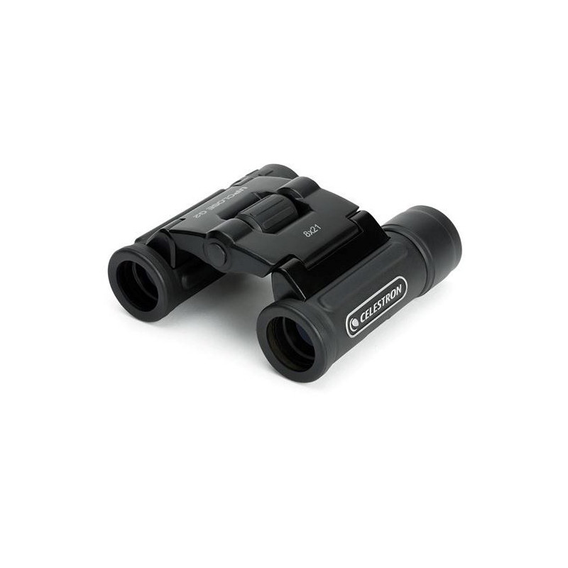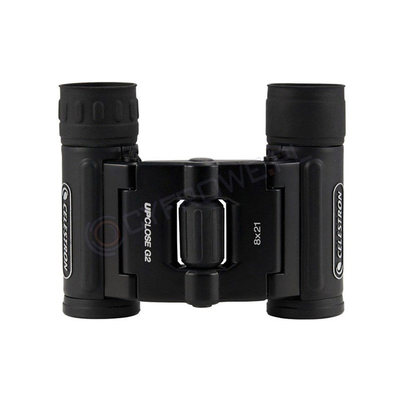 Celestron UpClose G2 8x21 telescopic binoculars have 8x magnification and a 7.4° field of view. The package includes a cleaning cloth, user manual, and cassette storage case.
