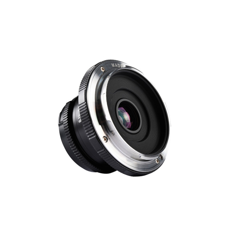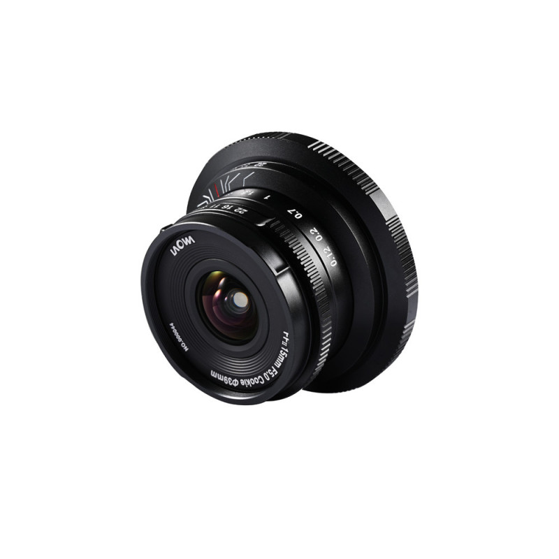 The Laowa 15mm f/5 Cookie FF is a compact, flat ultra-wide-angle lens designed for full-frame SLR cameras. It features a 110° angle of view, a close focusing distance of 12 cm, and manual aperture control.