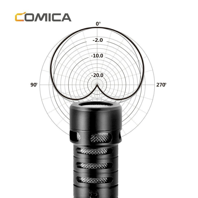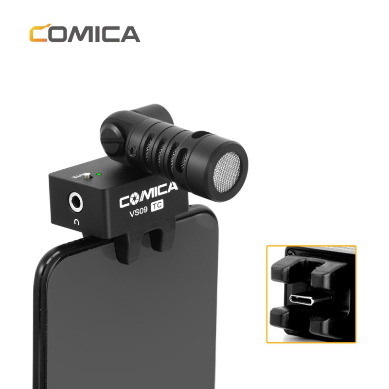 The Comica CVM-VS09 TC is a wired microphone designed for smartphones, DSLR cameras, camcorders and audio recording devices. It features a 3.5mm TRRS connector, a frequency response of 20Hz to 20kHz, and a cable length of approximately 6m.