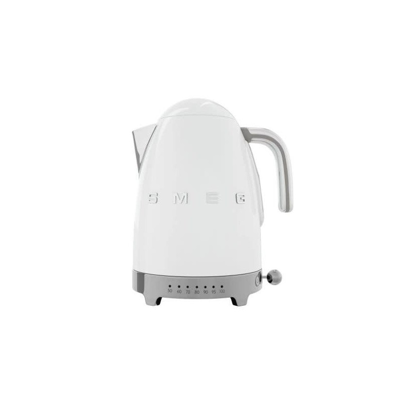 The Smeg 50s style kettle has a 1.7 L capacity and a powerful 2400 W heating element. It features a removable stainless steel filter, 360° rotating base and automatic shut-off for safety.