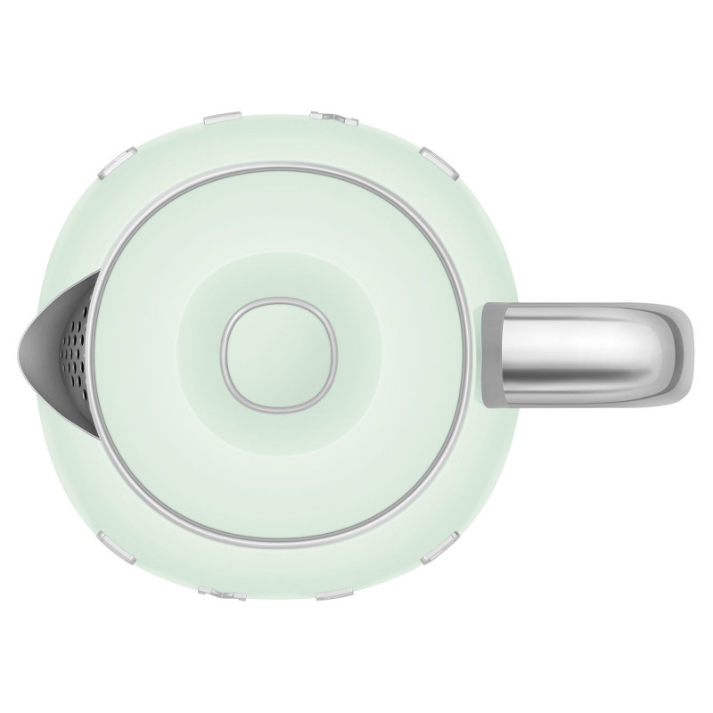 The SMEG Kettle Mini 50'Style has a 0.8 liter capacity and operates at 1400 watts. It features a 360-degree rotating base, boil-dry protection, and an automatic shut-off function.