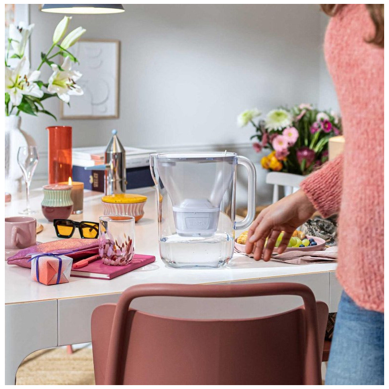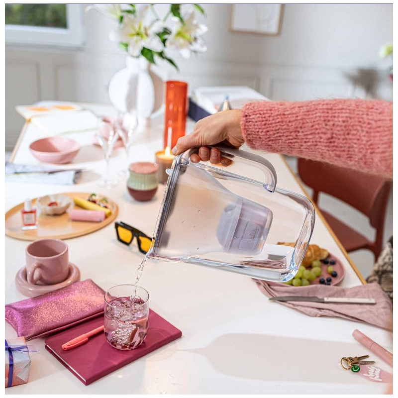 The BRITA Style ESSENTIAL XL is a water filter jug with a 3.6 L water tank and a 2.3 L filtered water tank. It features MAXTRA Pro filtration technology and an ergonomic design with a lift-up lid for easy filling.