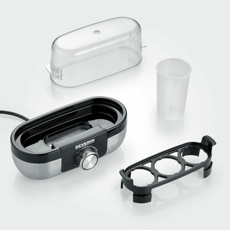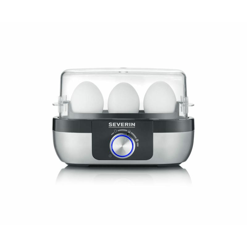 The Severin egg cooker can boil up to three eggs with adjustable hardness settings for soft, medium or hard eggs. It has a precise water measuring cup and a BPA-free construction for safety.