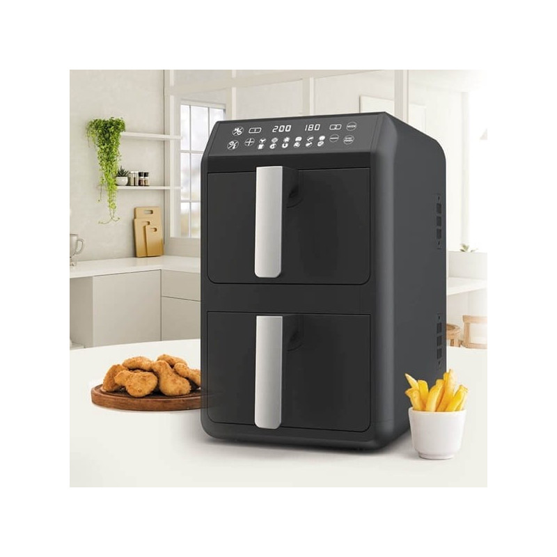 The 2400W MR-761 MAESTRO oil-free fryer has a 10 L capacity and 12 pre-set cooking programs. It features an adjustable thermostat with a temperature range of 80°C to 200°C, as well as two frying baskets for convenience.