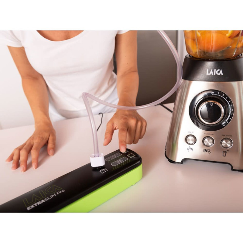 The LAICA vacuum machine has a maximum working width of 30 cm and operates at a vacuum of 600 mbar. It includes functions for sealing only and vacuum sealing, with a power consumption of 85 W.