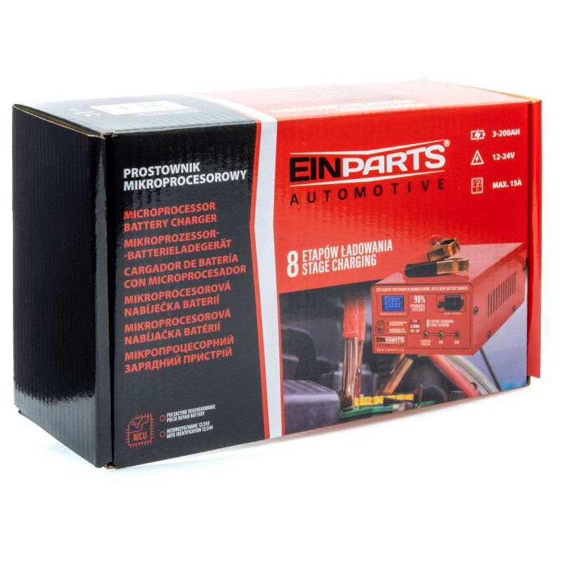 This charger offers advanced charging features from EINPARTS. Powered by 230V AC, it offers 12/24V output, ensuring versatile charging. The charger is ideal for charging batteries in cars with START/STOP engines. Technical data: