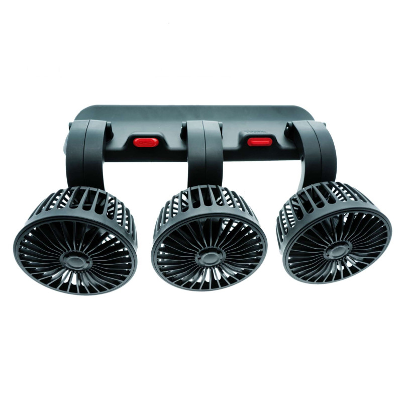EPFAN01 - Triple car fan 12V EPFAN01 it's practical triple car fan voltage-powered 12V, ideal for passenger cars, vans, and campers. Three independently adjustable fan heads allow you to direct the air flow in any direction, significantly improving air circulation in the cabin, especially on hot days. The fan offers 2 operating modes - low and high gear - operated by means of three-position switch (OFF / LOW / HIGH). Each head can rotate 360° horizontally and up to 180° vertically, which allows you to precisely adjust the airflow direction to your individual needs. Additionally, the fan is equipped with built-in tray for fragrance tablets - the set includes one refreshing tablet. Included in the set: