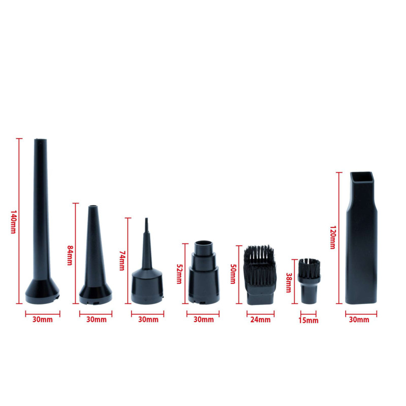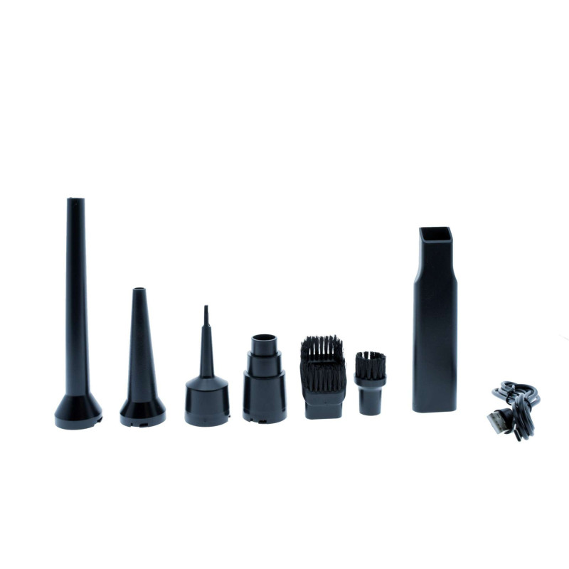 EPACC115 - 4-in-1 Cordless Car Vacuum Cleaner with Pump, Blower and Inflator Functions EPACC115 is an efficient, compact cordless vacuum cleaner for a car that combines 4 functions in 1 device - Vacuum, inflate, blow, and blower functions. It's the perfect solution for quickly cleaning the car interior, inflating mattresses, balls, or camping accessories, as well as removing dust from hard-to-reach places or clearing air vents. Equipped with brushless motor, provides high suction power up to 15,000 Pa (±10%) and a pumping and blowing function with a capacity of up to 680 L/min. Built-in battery level indicator allows you to easily monitor the charge, and the battery allows up to 30 minutes of operation depending on the selected mode. Features: - Vacuuming: up to 15,000 Pa (3 power levels)- Blowing: up to 680 L/min (low pressure)- Blower (blowing): up to 680 L/min- Pumping: max. pressure 15,000 / 12,000 / 6,000 Pa (±10%) Characteristics: - HEPA filter - washable and reusable - 3-stage power regulation: green (low), yellow (medium), red (high) - LED battery level indicator - Compact design and low weight - Working time: up to 30 minutes - Charging time: 3-4 hours The set includes 7 tips: Two for vacuuming (a classic extension and a brush attachment) and five for inflating, blowing, and deflating, mounted on the other side of the device. These include attachments for mattresses, beach accessories, crevices, vents, and for removing dust from hard-to-reach places. Technical specifications: