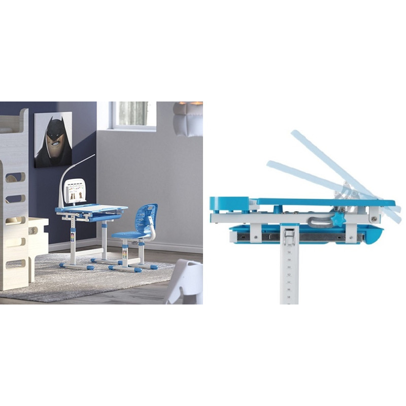 This is a 'growing' ergonomic desk and ergonomic chair for children that adapt to the needs of a growing child over the years. The height of the desk is adjustable from 54 to 76cm, the seat depth of the chair is adjustable from 32 to 44cm, and the backrest reaches 67-79cm. The maximum load of the desk is 75kg, the chair load is 100kg. The desk even has a functional socket where you can insert an LED light.