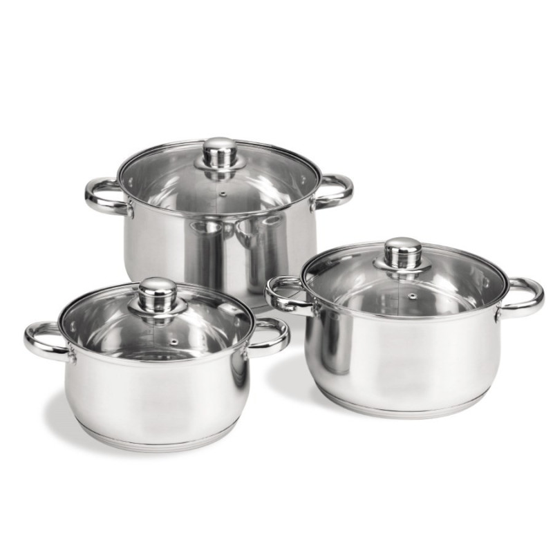 The Maestro MR-2020-6XL is a set of three stainless steel pots with glass lids, suitable for various types of stoves, including induction and gas. Each pot has a diameter of 20 cm, 22 cm and 24 cm, and they are dishwasher safe, making them easy to maintain.