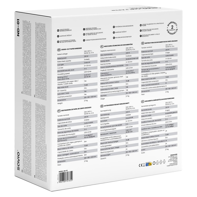 The Savio ND-01 paper shredder offers cross-cut shredding with level 4 security, capable of shredding up to 6 A4 sheets at a speed of 2250 mm/min. It has a noise level of 72 dB, a 3-minute duty cycle and a reverse function for clearing jams.