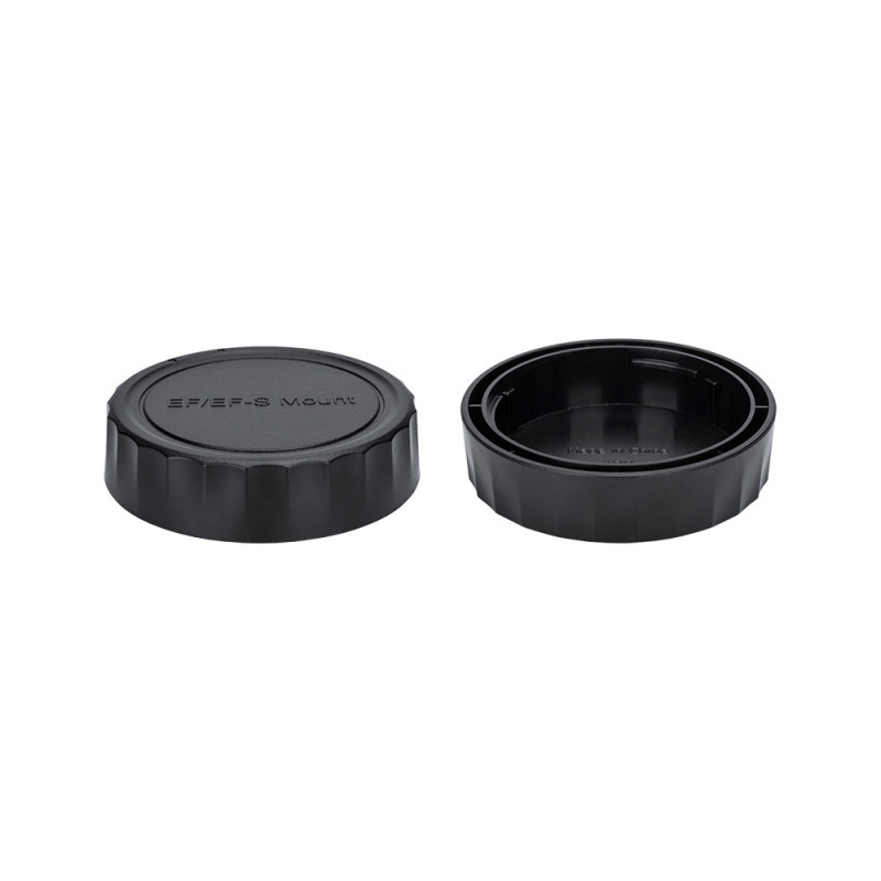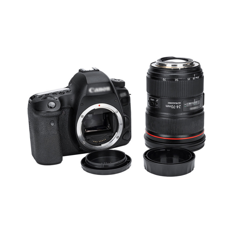 Camera body cap and rear lens cap designed for Canon EF/EF-S mount cameras and lenses. Made from lightweight and durable ABS material, these caps protect the camera's image sensor and lens from dust, moisture, scratches and fingerprints when not in use.