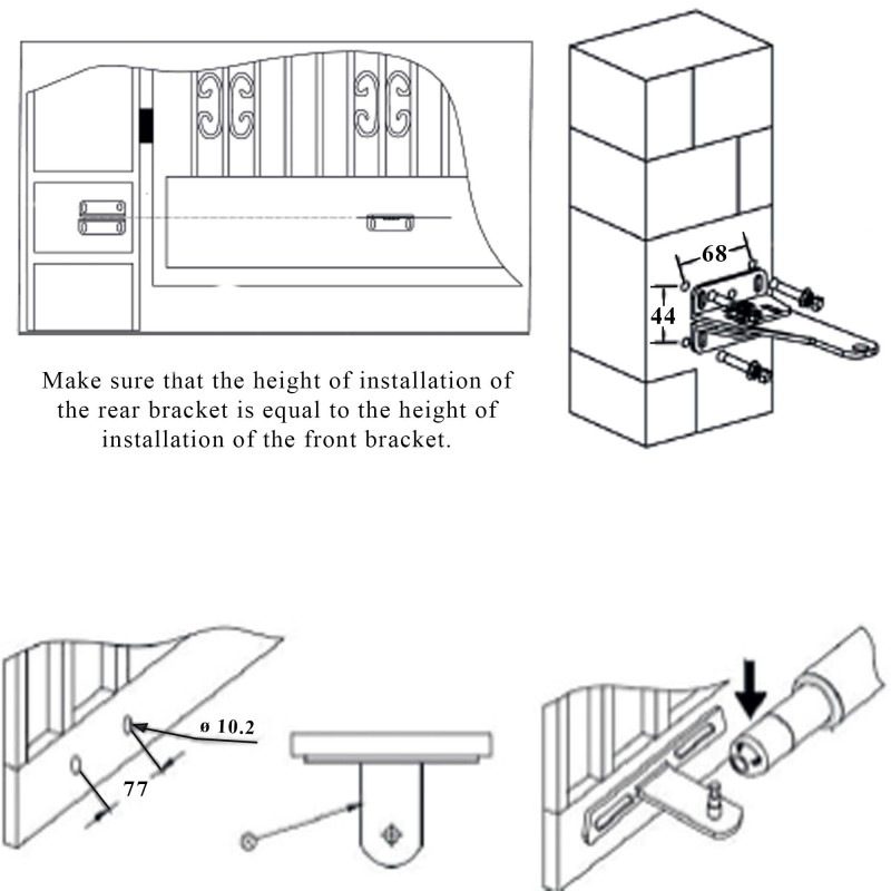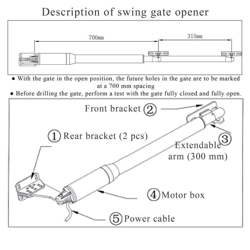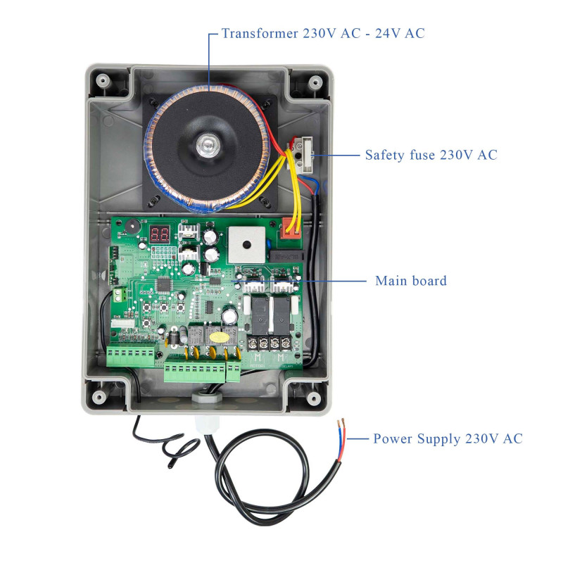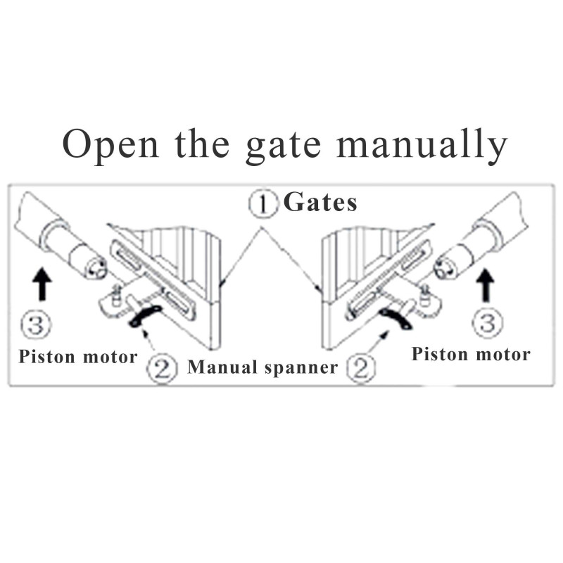 Swing gate opening automation package, includes control unit, 2 40W piston motors, two remote controls, 2 photocells, signal lamp and mounting accessories.